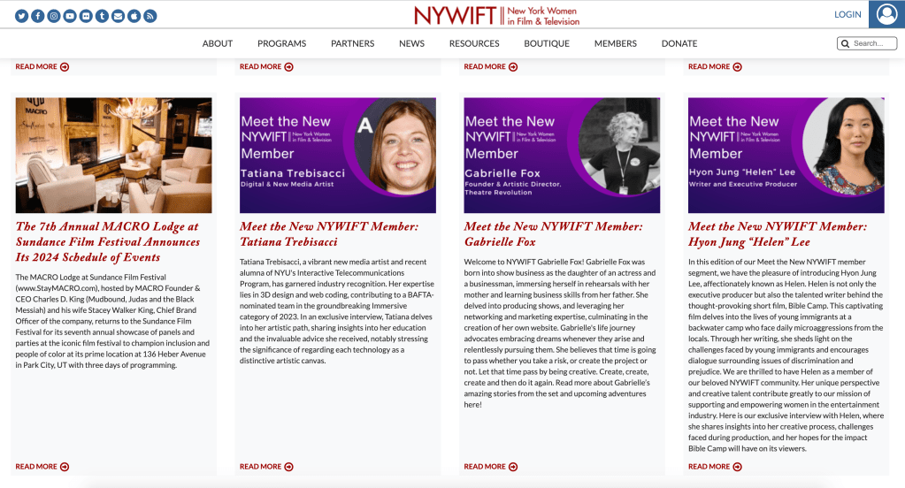 I am an active member of New York Women in Film & Television (NYWIFT)‘s communications committee. The committee produces blog and podcast content relating to member profiles, industry events and masterclasses. As a new member, I was interviewed by the organization and had my responses published on the blog. As a communications committee member, I conducted 2 interviews for other new members, and published them on the blog. I also serve as social media and programming coverage brand ambassador, producing photos and posts tagging @NYWIFT.